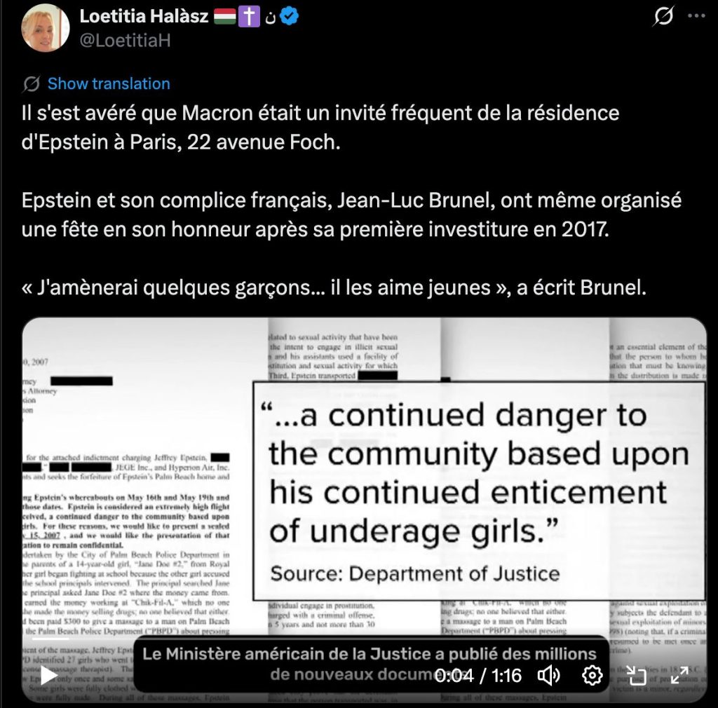 Pendant des décennies, la gauche politique et médiatique l’a soutenu et en a fait son héros. Aujourd’hui, il est une sorte de paratonnerre qui permet de dévier la foudre et de protéger des zones, des secteurs, des individus, des personnalités beaucoup plus sensibles. C’est un leurre. On détourne l’opinion, on envoie la meute à la chasse aux Lang. Pendant ce temps, on ne regarde pas là où il faudrait regarder… peut-être du côté de Macron. Sur le site du département de la justice américain, des images, des noms, des visages, des pages entières sont caviardés. Ainsi, des pages concernant Macron sont introuvables. Un échange entre Epstein et X en France :